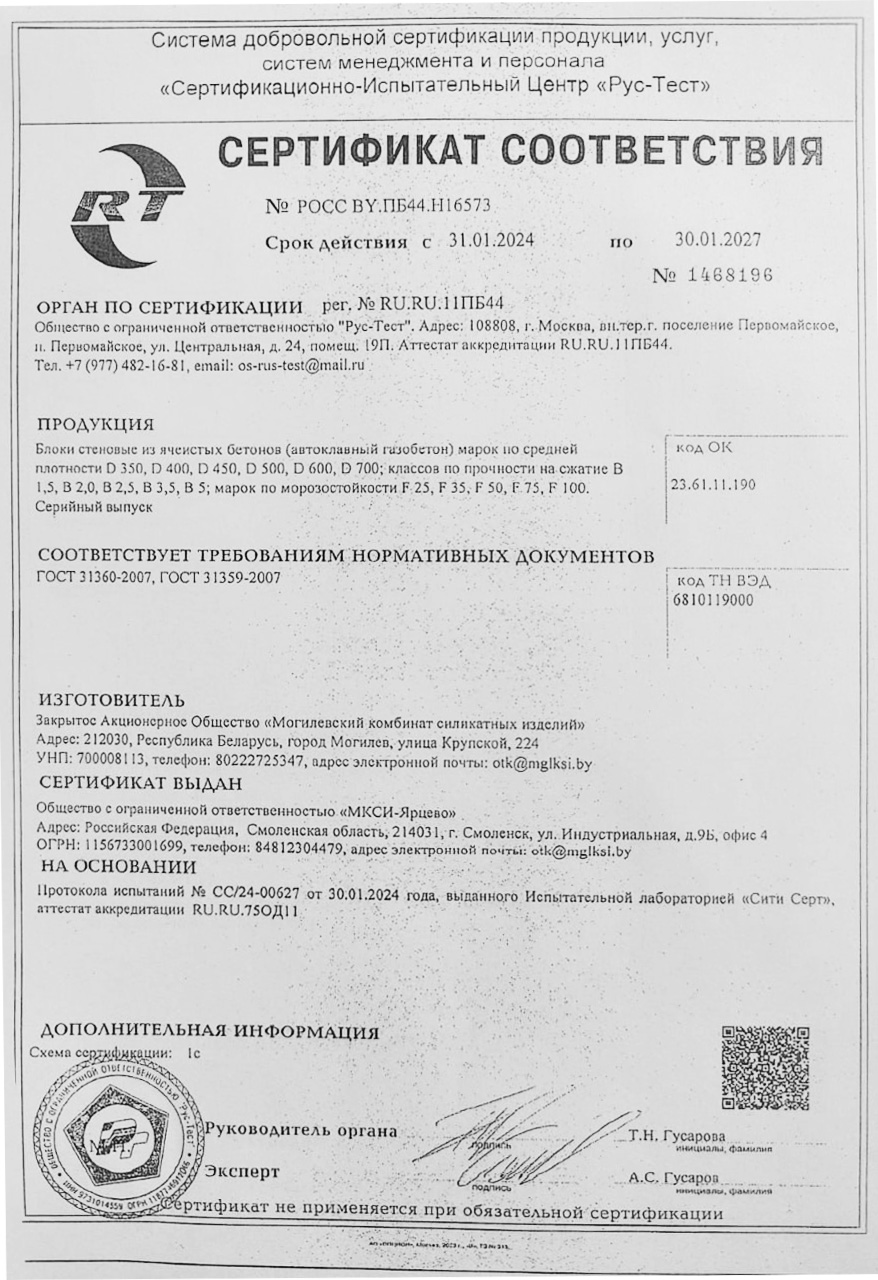 Плотность газобетона обозначается буквой D и числом, которое указывает на среднюю плотность материала в кг/м³. Газобетон Могилевский КСИ D400 имеет плотность 400 кг/м³, что обеспечивает оптимальное соотношение прочности и теплоизоляции.